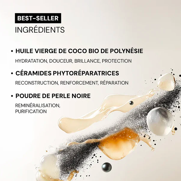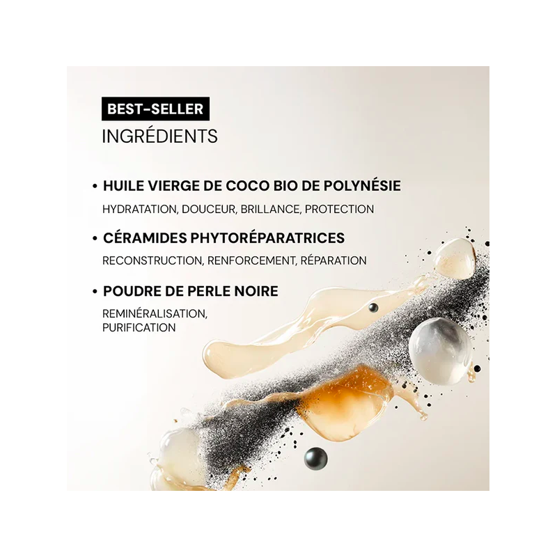 Complexe d'huile de coco bio et de poudre de perle noire de Tahiti. L'huile de coco BIO issue des sols coraliens purs de Polynésie se distingue par sa pureté absolue. Elle nourrit, renforce et hydrate en profondeur. La perle noire, Joyau des Lagons Polynésiens, purifie les cheveux et les reminéralise. Sa poudre fine et nacrée est riche en minéraux et oligo-éléments.